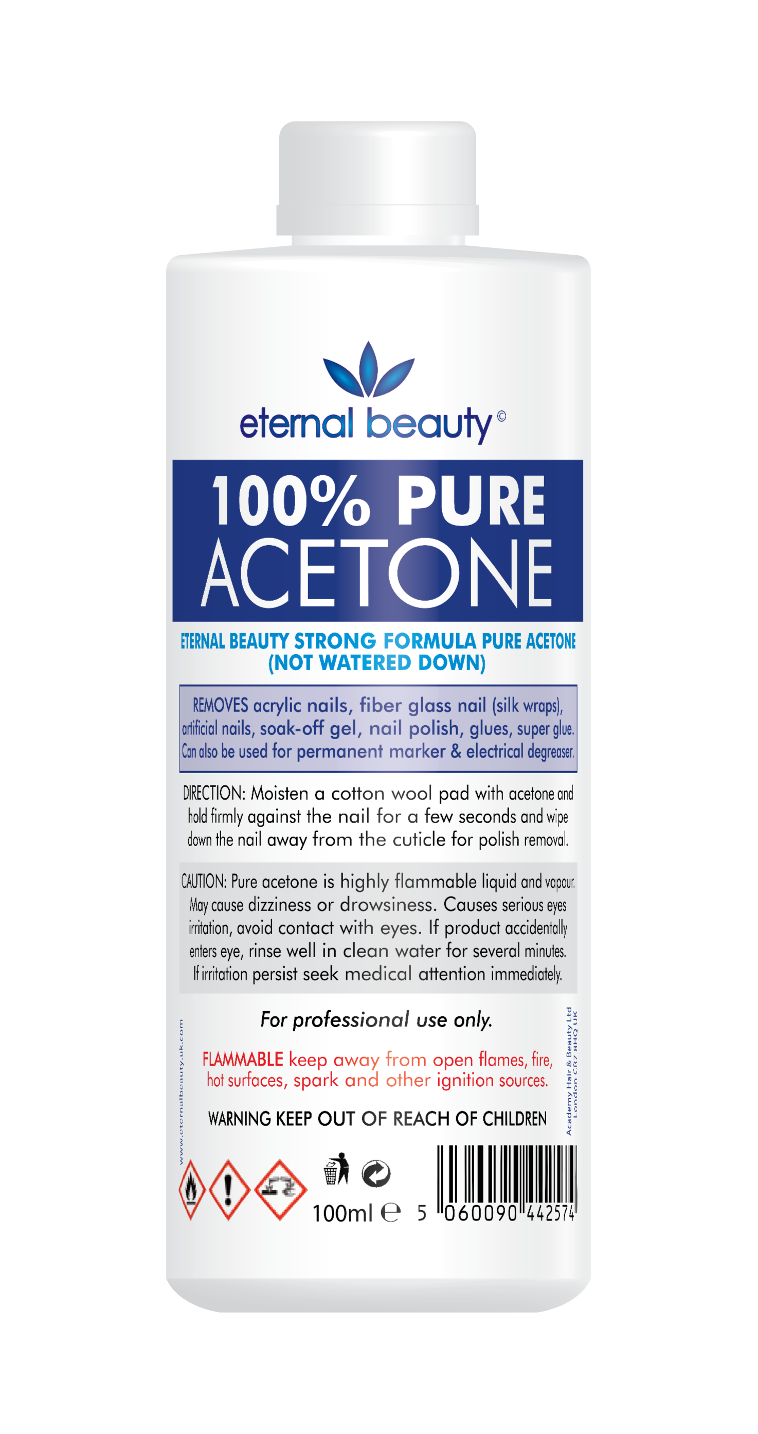 Eternal Beauty 100% Pure Acetone is a premium, high-purity solvent ideal for a range of cosmetic and cleaning applications. This 100mL bottle offers the strength and effectiveness of pure acetone, making it perfect for removing nail polish, cleaning cosmetic tools, and addressing stubborn stains. Its large size ensures you have ample supply for frequent use, whether at home or in a professional setting.