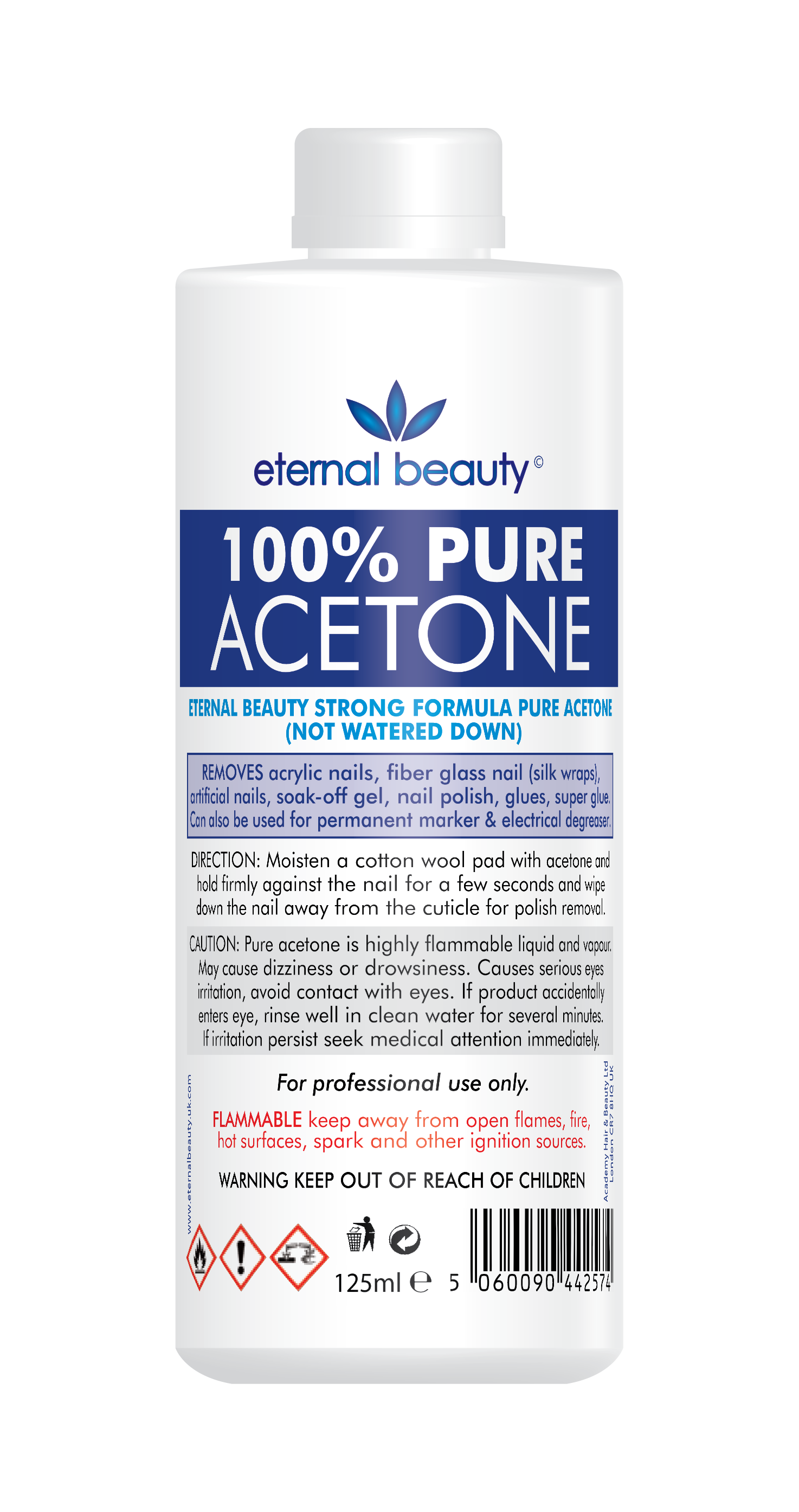 Eternal Beauty 100% Pure Acetone is a premium, high-purity solvent ideal for a range of cosmetic and cleaning applications. This 125ml bottle offers the strength and effectiveness of pure acetone, making it perfect for removing nail polish, cleaning cosmetic tools, and addressing stubborn stains. Its large size ensures you have ample supply for frequent use, whether at home or in a professional setting.