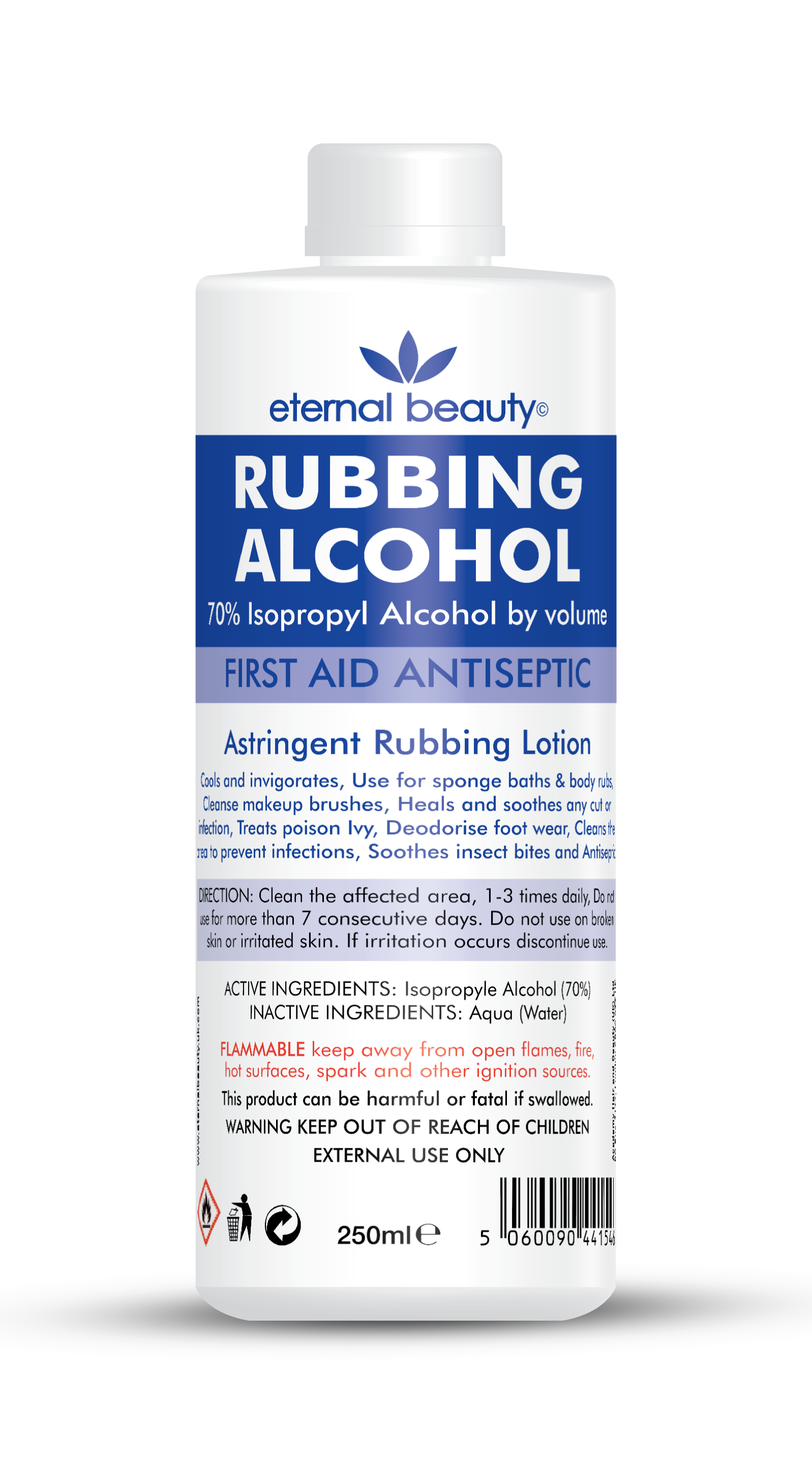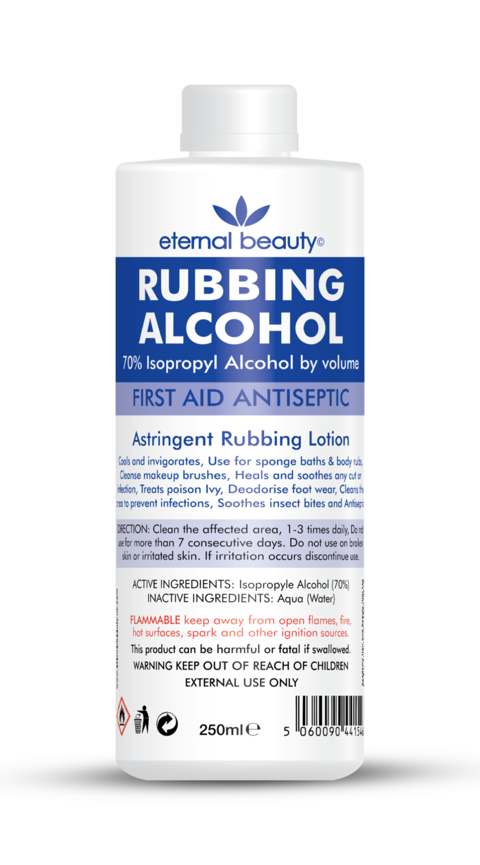 Eternal Beauty 70% Rubbing Alcohol is a versatile and powerful solution for disinfection and sanitization. This 250mL bottle is designed for effective application, making it perfect for sanitizing hands, disinfecting surfaces, and general hygiene purposes. With a 70% alcohol concentration, it provides robust germ-killing power, ensuring a higher level of protection for you and your environment.