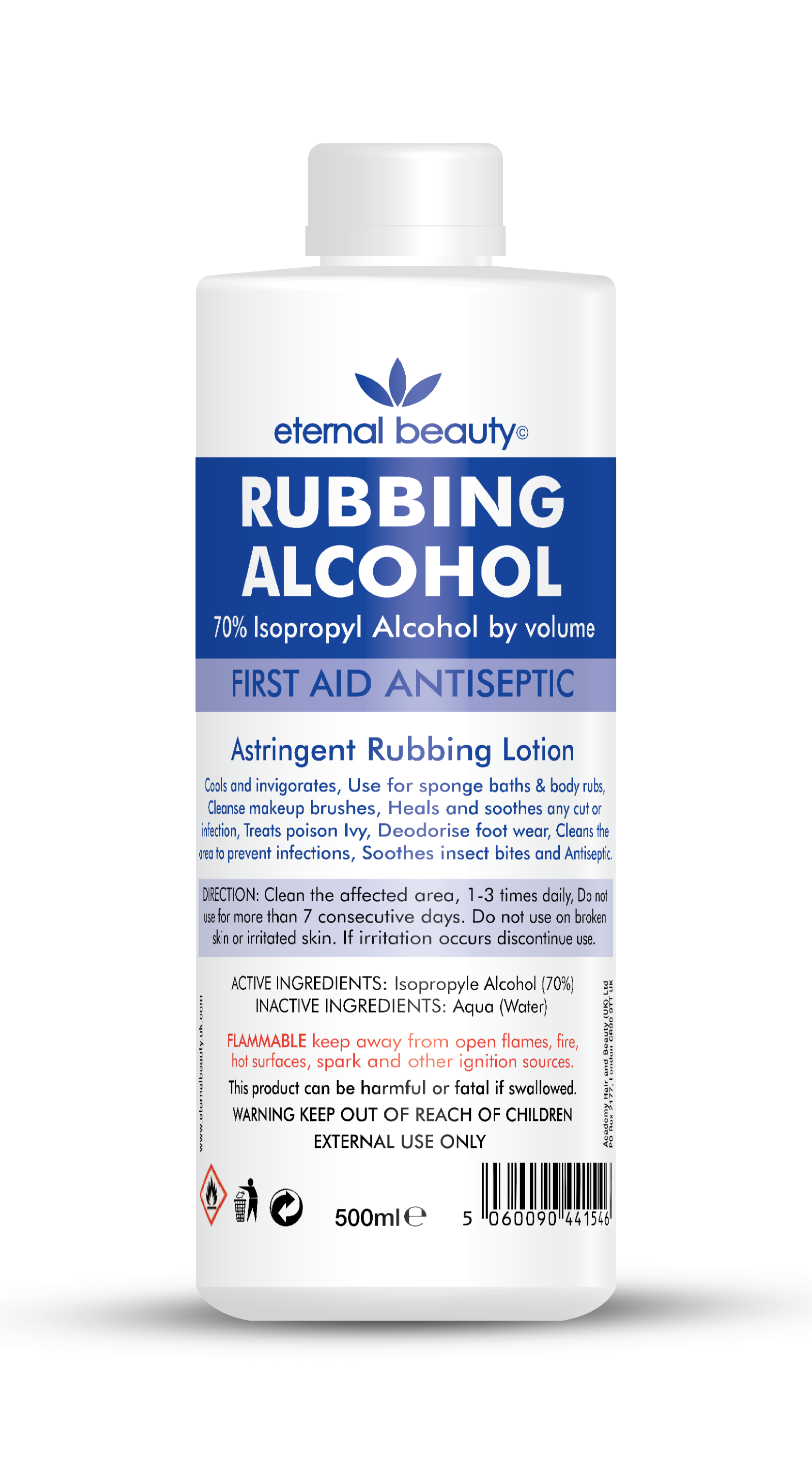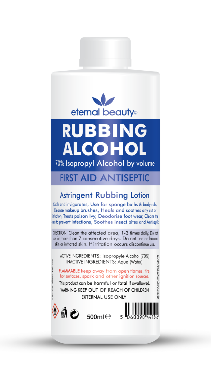 Eternal Beauty 70% Rubbing Alcohol is a versatile and powerful solution for disinfection and sanitization. This 500mL bottle is designed for effective application, making it perfect for sanitizing hands, disinfecting surfaces, and general hygiene purposes. With a 70% alcohol concentration, it provides robust germ-killing power, ensuring a higher level of protection for you and your environment.