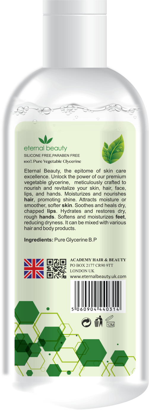ETERNAL BEAUTY Pure Vegetable Glycerin is a powerful humectant that draws moisture into the skin, delivering deep and long-lasting hydration. Its pure and natural formulation ensures your skin receives the best care without any harsh chemicals or additives.