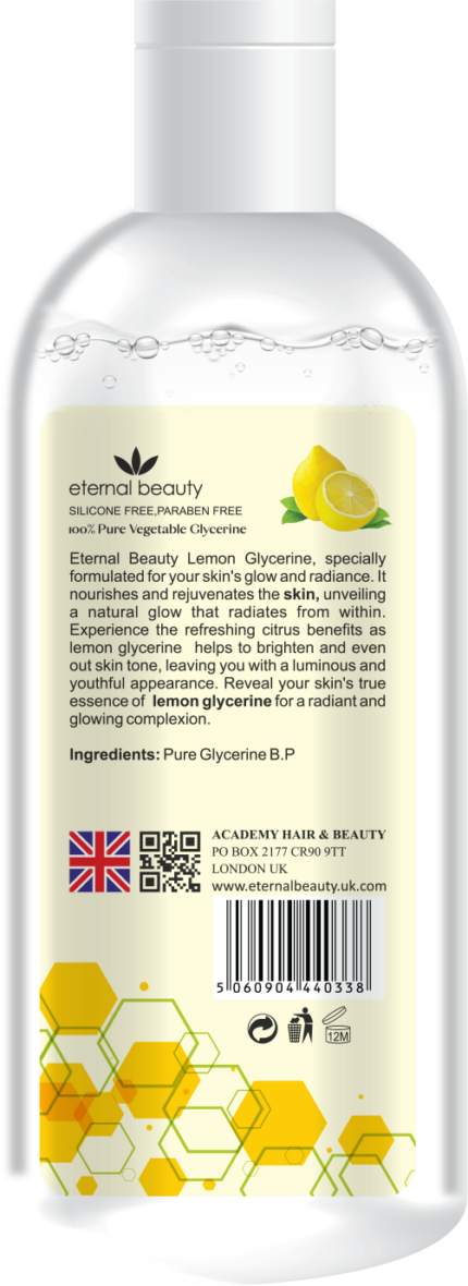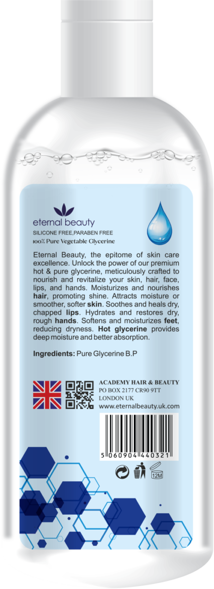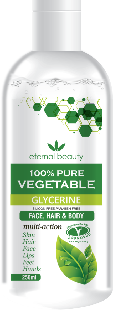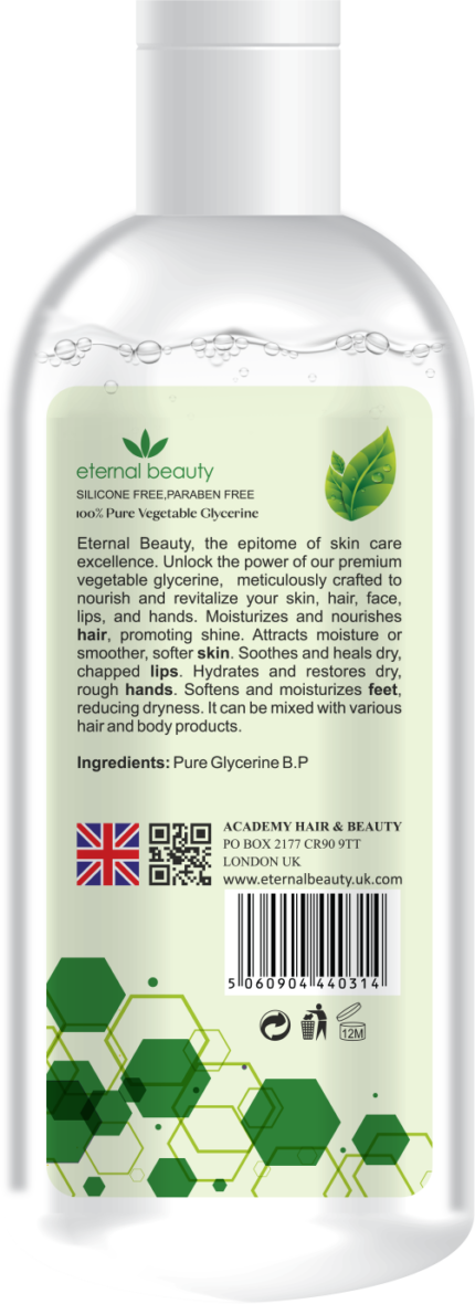 Enhance your skincare and haircare routine with ETERNAL BEAUTY Pure Vegetable Glycerin, and experience the benefits of deep hydration, soothing relief, and improved texture for your skin and hair.