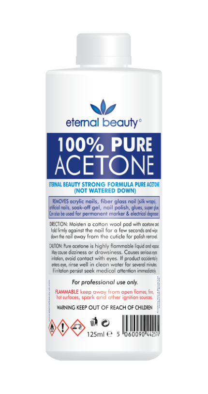 Eternal Beauty 100% Pure Acetone is a premium, high-purity solvent ideal for a range of cosmetic and cleaning applications. This 125ml bottle offers the strength and effectiveness of pure acetone, making it perfect for removing nail polish, cleaning cosmetic tools, and addressing stubborn stains. Its large size ensures you have ample supply for frequent use, whether at home or in a professional setting.